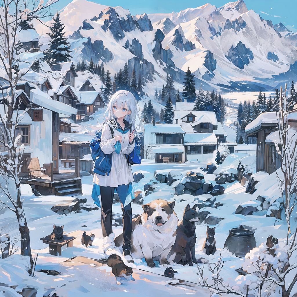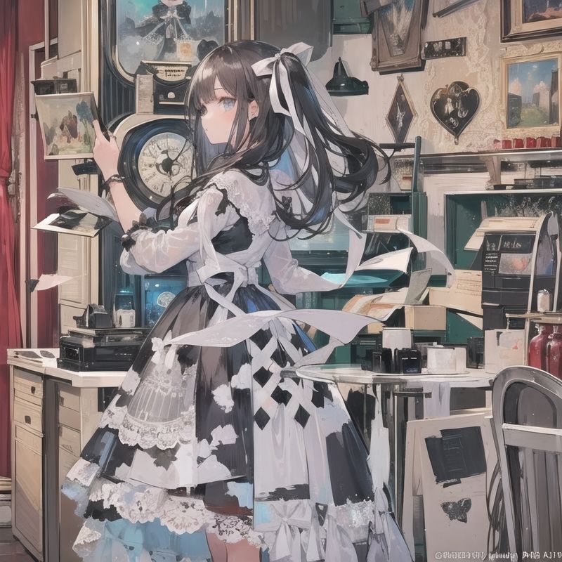 (1 girl:1.6), full body, from side, ultra wide shot, (azure blue dress:1.3), (grey long hair:1.3), (white ribbon:1.6), (white lace:1.6), BREAK, (dark background:1.3)Feather - by 代々木