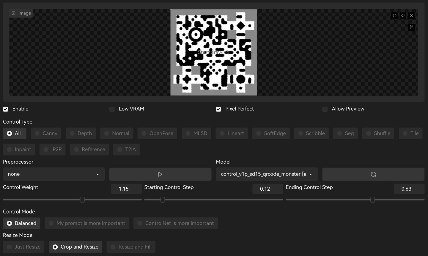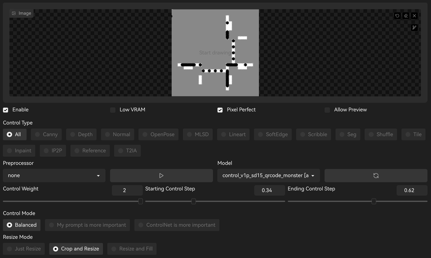 Usually, we use QR Code Monster or QR Code Pattern model as the main guidance model, and use the Brightness Model from IoC Lab as the auxiliary model to improve the local contrast.