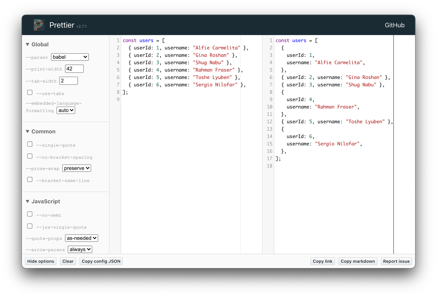 最让我感到头疼的是基于代码长度的自动换行或合并行的功能。 Prettier 有一个名为 printWidth 的概念,它限制每行适应固定的宽度(在默认设置里是80个字符)。通常情况下,让代码适合屏幕宽度,并避免水平滚动是一件很合理事情。